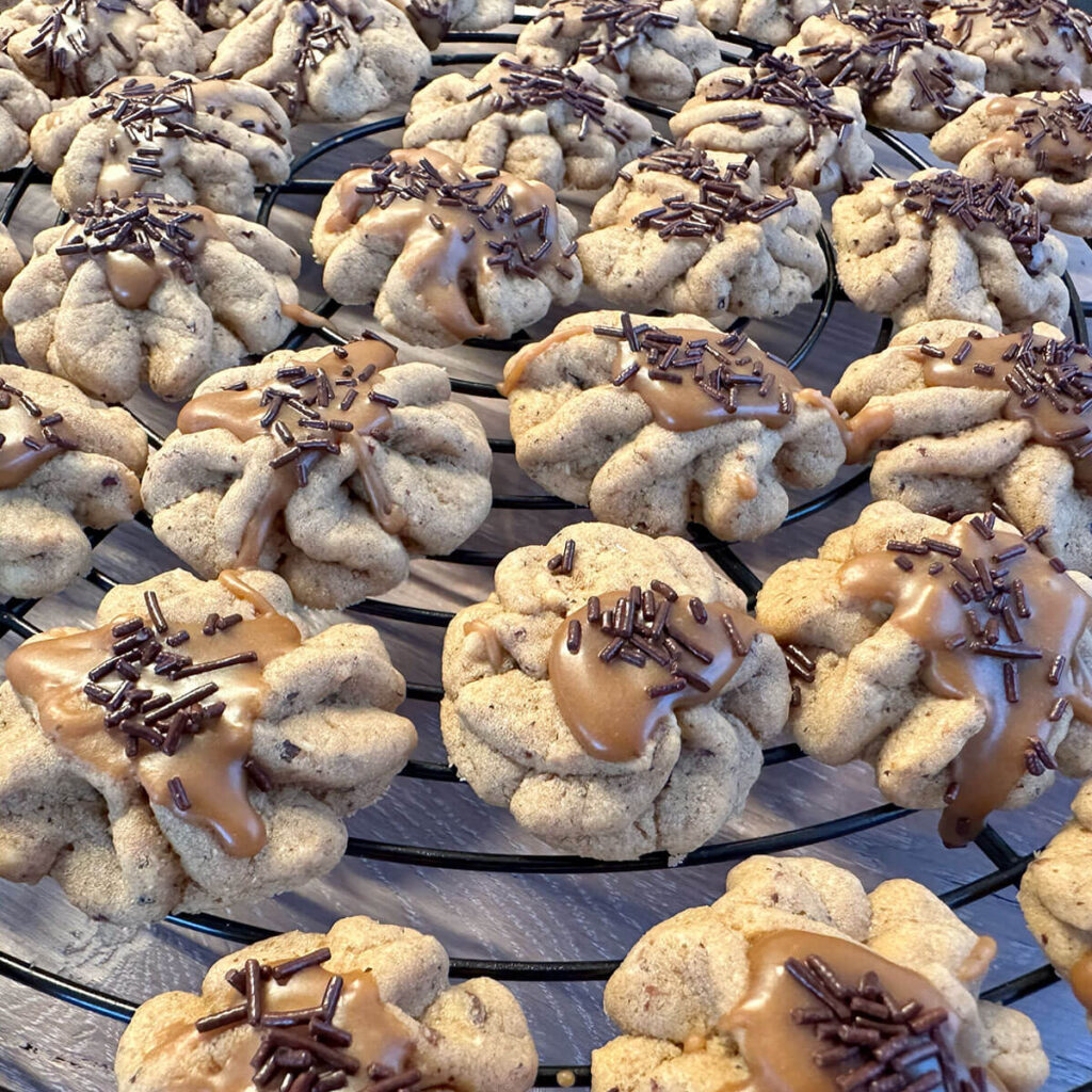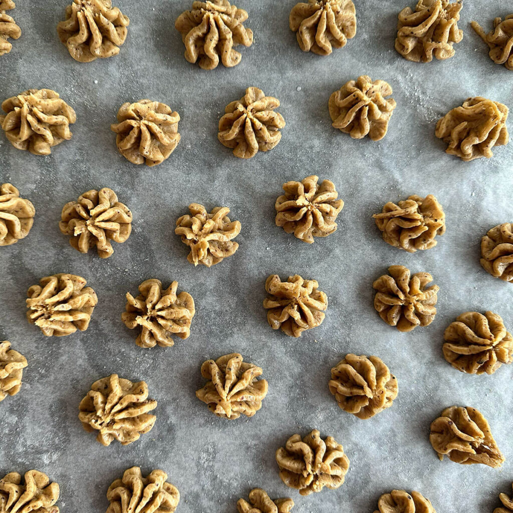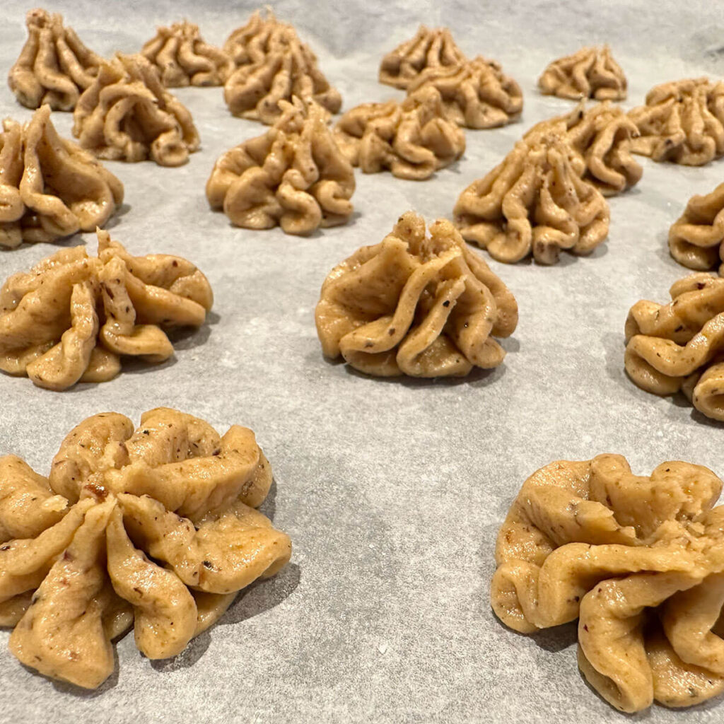 - Alle Zutaten gut vermischen und mit Spritzsack Röschen formen