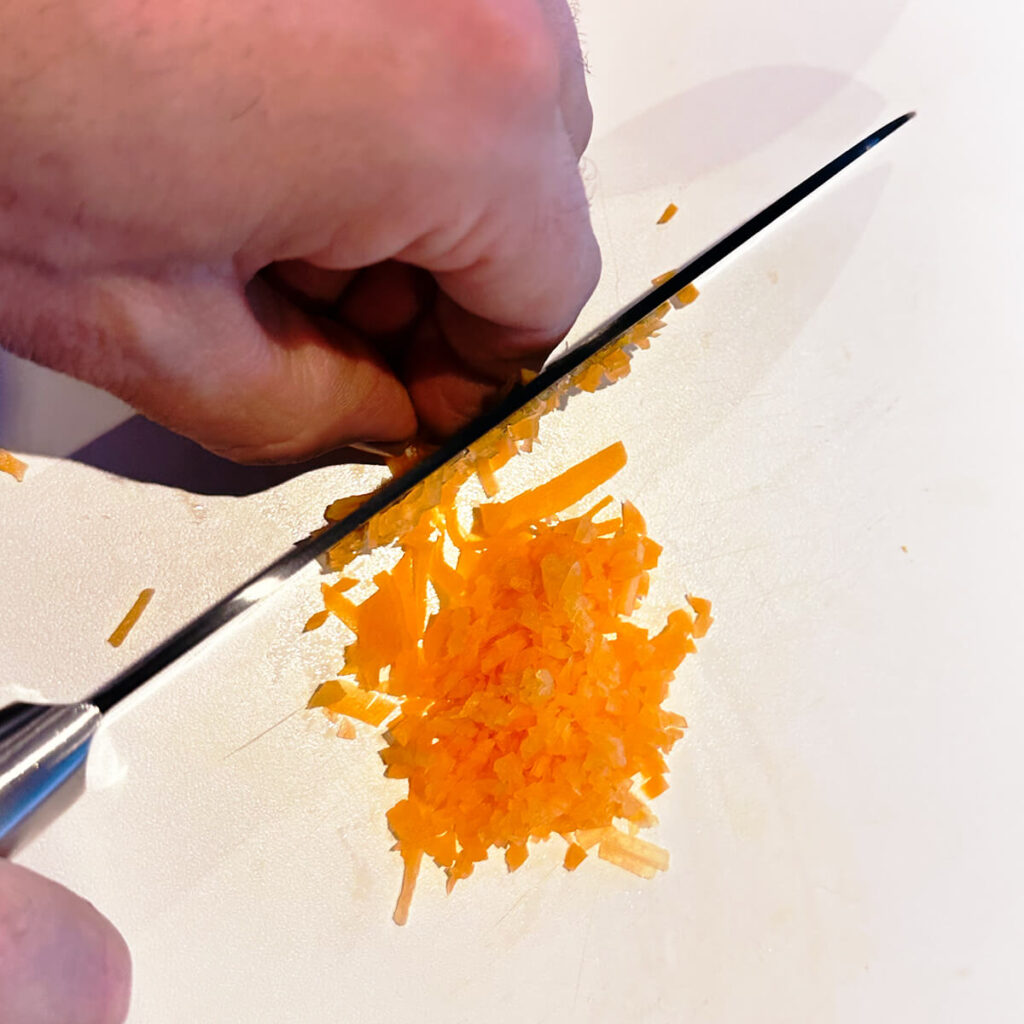 Die Karotten schälen und halbieren. Den «Kern» mit einem scharfen Messer V-förmig einschneiden, herauslösen und in sehr kleine Würfelchen schneiden. Diese Karottenwürfelchen mit Frischkäse, Mayonnaise und Kräutern nach Belieben mischen. Danach mit einem Messer zurück in die Vertiefung füllen.