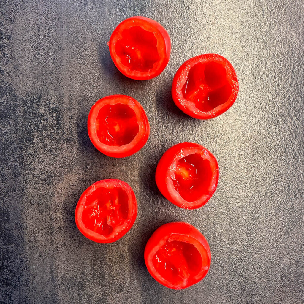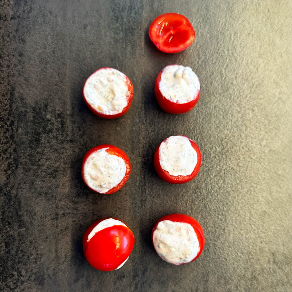 Cherrytomaten auf der gegenüberliegenden Seite des Stilansatzes (am Boden) bei ca. 3/4 abschneiden. Die Kernen und das Innengehäuse vorsichtig entfernen und zusammen mit etwas Mascarpone und Kräutern für die Füllung mischen. Die Tomaten füllen und den Deckel aufsetzen.