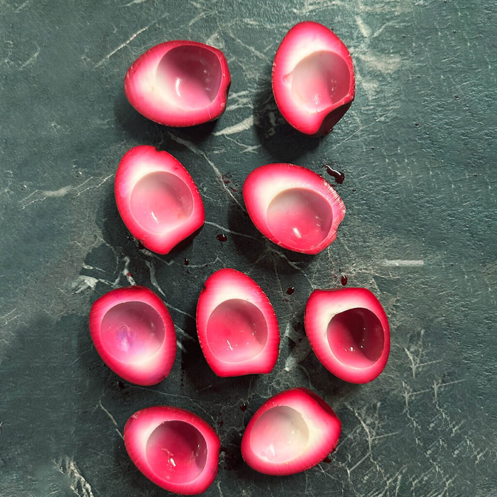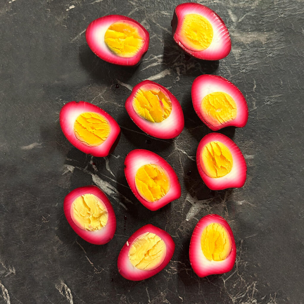 Gekochte Eier schälen und für ca. 6 Stunden in Randensaft einlegen. Danach herausnehmen, trocken tupfen und halbieren. Die gelben Dotter vorsichtig mit einem Teelöffel entfernen und in eine Schüssel geben. Das gestockte Eigelb mit Senf, Frischkäse, Kurkuma und Kräuter mischen, in einen Spritzsack füllen und in die Eihälften geben.